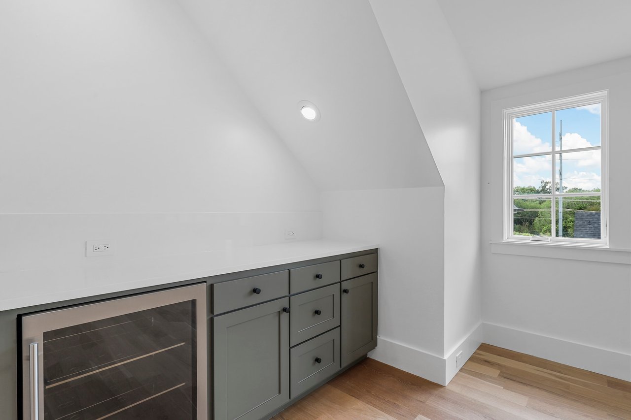 The pool house boasts large windows, and features a loft perfect for extra guests complete with a full bath, a bar with built-in ice maker, and ample amount of space for entertaining guests just above the two car garage.