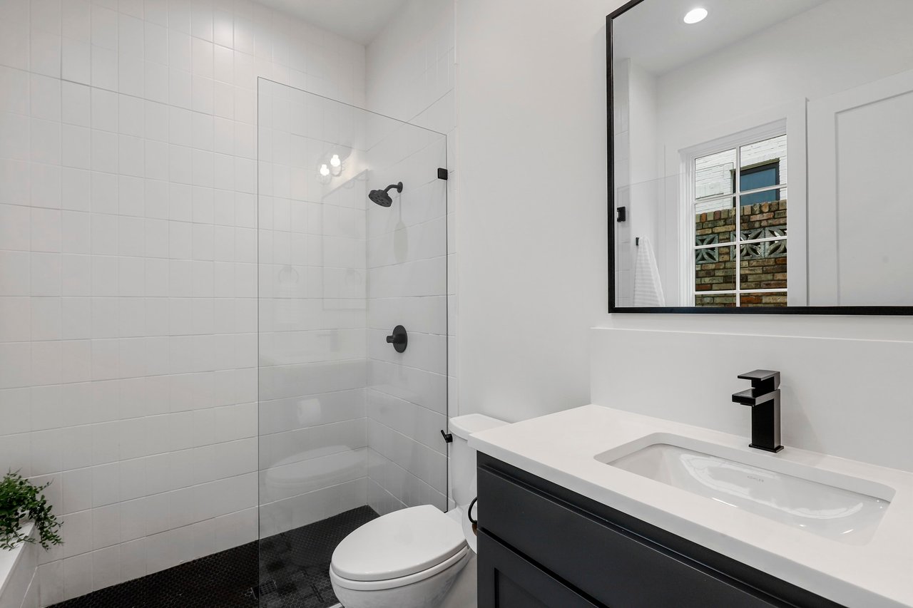 Enjoy your private primary bedroom tucked away on its own wing of the first floor with views of the pool, complete with a stunning en suite bathroom featuring modern finishes, a large walk-in closet, and a luxurious freestanding tub. The first of two laundry rooms is located in the hallway leading to a guest bedroom or private office featuring floor to ceiling windows and an en suite bathroom with timeless finishes.